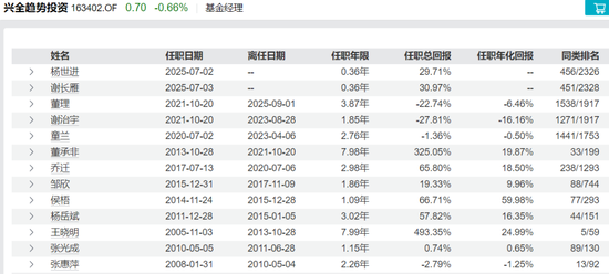 数据显示,童兰任职总回报为1.36%,谢治宇任职总回报-27.81%,董理任职总回报-22.74%。