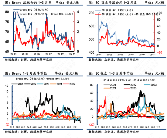 1) 价差:11月7日,SC 夜盘1-3月差-2.5元/桶,换算成-0.35美元/桶;Brent 1-3月差为0.39美元/桶;WTI 1-3月差为0.35美元/桶。SC夜盘-Brent主力合约为0.19美元/桶;SC夜盘-WTI主力合约为4.23美元/桶。