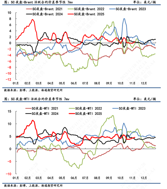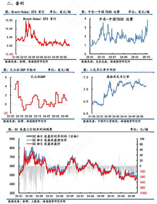 2)套利:①估值:11月7日凌晨2:30,Brent 2601盘面价为63.22美元/桶,SC 2602盘面价为462.1元/桶,测算SC 2602盘面理论价为485.9元/桶,当天盘面估值偏离程度-4.89%。从7天移动平均估值值中,以【-5%,0】为正常区间来看,已从上周的-0%修复回归到估值常态。②利润:测算SC2602盘面到岸利润-24.78元/桶,折合-3.8美元/桶。③价差:SC2602-Brent2601盘面差为1.06美元/桶,理论差4.54美元/桶,盘面价差低于理论价差。(注:上周Brent首行为2601;SC首行为2512;其中M代表时下11月)