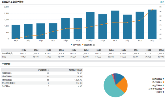 鑫元基金成立于2013年8月,作为一家典型的银行系基金公司,其控股股东为南京银行股份有限公司,持股80%,另一股东为股份有限公司,持股20%。强大的股东背景为其带来了天然的渠道资源和稳健的经营风格。截至2025年9月30日,鑫元基金资产管理规模达到2288.9亿元,其中非货币资产管理规模为1401.77亿元,在全部162家公募基金管理人中排名第34位。这一数据表明,公司已稳居行业中上游水平,尤其在固收等传统优势领域根基深厚,其中债券型产品+货币型产品占整体公募基金资产规模的97%。