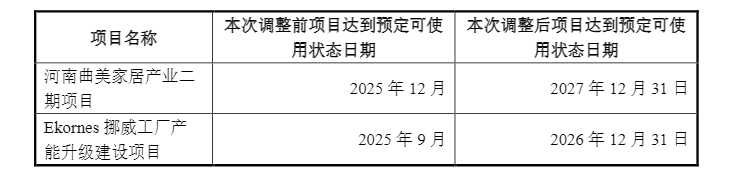 2024年1月,曲美家居完成定向增发,合计募资5.45亿元,计划投入河南曲美家居产业二期项目(拟投资3.66亿元,使用募资资金3.5亿元)和 Ekornes 挪威工厂产能升级建设项目(拟投资2.45亿元,使用募资资金2283万元),原计划两个项目分别于2025年12月和9月达到预定可使用状态。