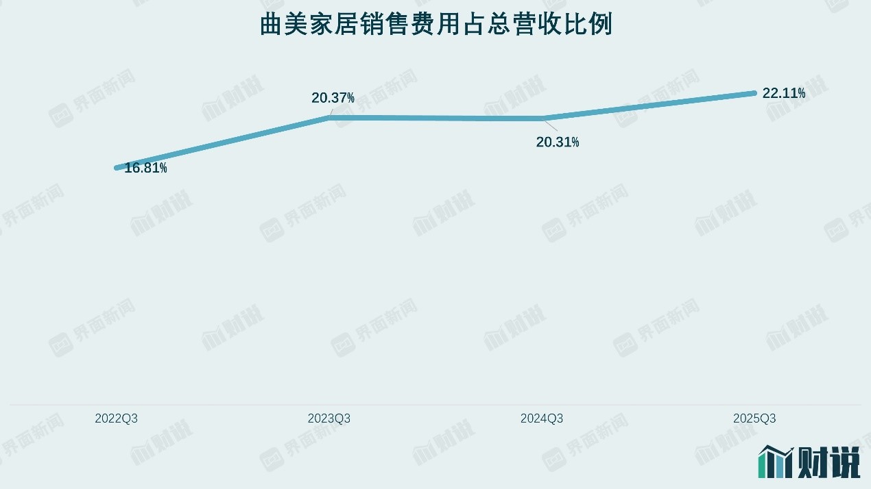 与营收持续下滑形成鲜明对比的是,曲美家居的销售费用逆势攀升,成为吞噬利润的 “黑洞”。2025 年前三季度,公司销售费用高达 5.65 亿元,同比增长 5.65%,占总营收的比例达到 22%,创出近四年以来的占比新高。