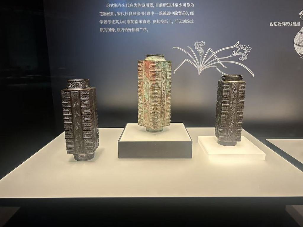 韦心滢介绍,宋元明清铜器的发展最关键的是宋徽宗和清高宗两位皇帝对礼制复古的推动,所以第一板块以这两位皇帝作为引子,展出的多为仿古铜器, 其中大部分为宋徽宗时期所铸造,靖康之乱后,北宋皇室收藏与新成礼器大多散失,所以留存下来尤为难得。