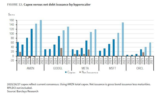 巴克莱在报告中指出,尽管超大规模供应商的资本支出计划早已不是秘密,但此前该行业的头部公司主要依靠自身强劲的经营现金流来支持扩张,很少在债券市场进行大规模融资。