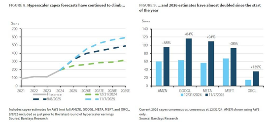同时,各大公司的资本支出预测持续被上调。自2025年初以来,行业对未来几年的资本支出预测几乎翻了一番。
