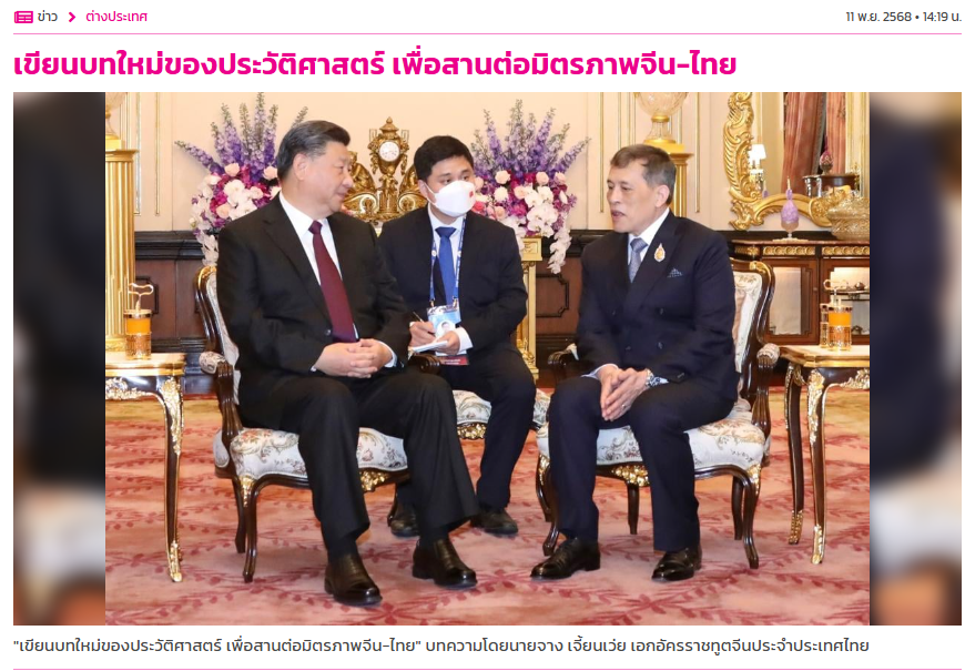 11月11日,在泰国国王哇集拉隆功即将对中国进行国事访问之际,驻泰国大使张建卫在《泰叻报》《每日新闻》《经理人报》等泰国主流媒体发表署名文章《为赓续中泰友好再谱历史新篇》。全文如下: