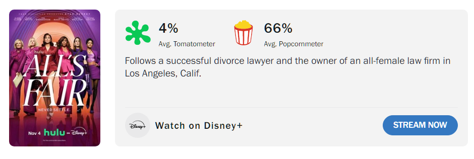 由金卡戴珊、娜奥米沃茨、莎拉保罗森、格伦克洛斯主演的律政剧《诉讼女王》(All's Fair),11月4日在迪士尼旗下的流媒体平台Hulu上率先放出了第一季的头三集。不承想,由艾美奖得主、《欢乐合唱团》和《美国恐怖故事》的幕后主脑瑞恩墨菲打造的这部星光熠熠的九集迷你剧,很快就收到近年来最令人咋舌的负面评价,其中不乏零星差评。一时之间,几乎所有媒体都在讨论:现象级的《诉讼女王》会不会就是人类历史上最烂的一部电视剧?