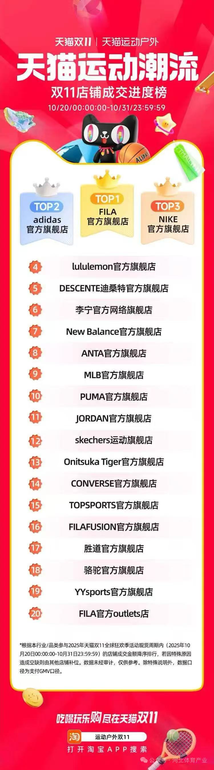 据第三方电商数据机构久谦中台发布的《双11大促首阶段分析》报告,2025年双十一期间,运动户外行业保持爆发式增长,天猫正式开卖后,斐乐、耐克、lululemon成交快速破亿。