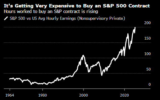 从非常现实的意义上来说,估值也变得很高了。用平均时薪来算,买一份标普500指数合约所需的工作长度已飙升至200多个小时。而在新冠疫情爆发前夕,这一数字仅为140小时。就算在2000年市场触顶时也只略高于100小时,而此后两年美股下跌了超过50%。