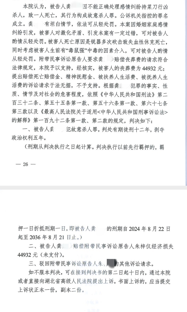 法院判决龚某珍故意杀人罪有期徒刑12年,剥夺政治权利五年,赔偿刑附民原告人小朱44932元。