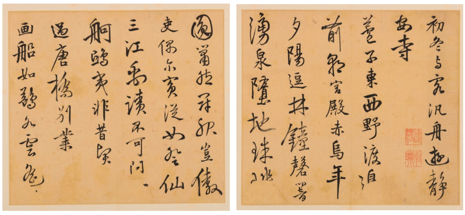 游览家乡胜景,访友展玩书画,这本是陆深燕居生活中平凡的两天,但静安古刹悠久的历史文脉,令他遥想起这片土地上的古圣名贤,大禹治理的三江时已换了面貌,范蠡功成身退隐于五湖,而他致仕隐居的人生际遇又与古人是否有几分相似?在第二日独自舟行归家的时刻,林梢落日,渔樵隐逸之景再次引发了他对隐逸生活的古今联想,古今自然地景的变化如此之大,而一地文脉仍然赓续。酝酿已久的两首诗涌上心头,待他回到府邸,即刻提笔书写了下来。这便是明代陆深的《行书上海二日游诗二首》册,现藏于上海博物馆。(图一)