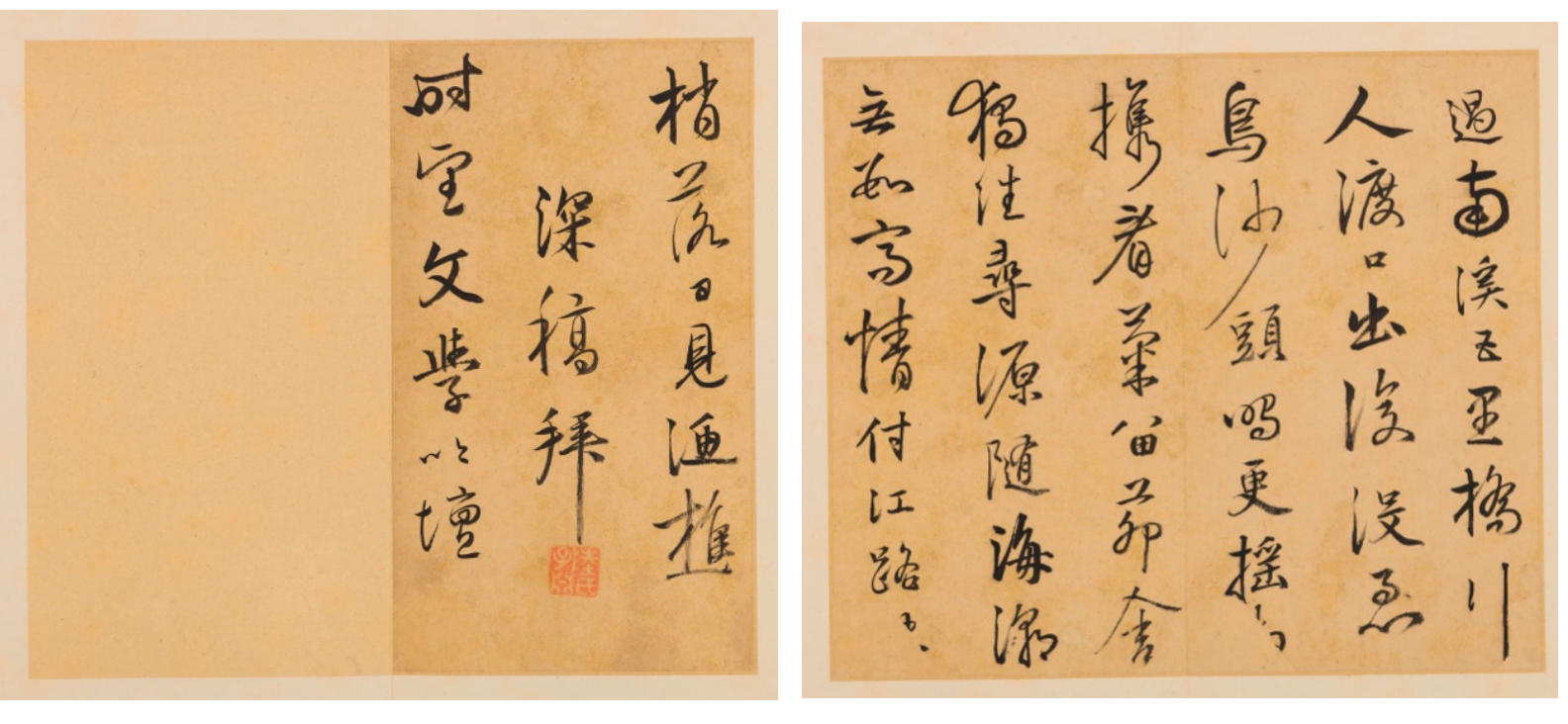 家门前这条黄浦是陆深出行的必经之路,承载了他太多深厚的情谊和超逸的哲思。回归居所,陆深提笔书写下这两首诗,款署“深稿,拜时望文学吟坛。”知是写予友人的诗稿。上款“时望”,即姚云,字时望,著有《竹斋集》,为陆深挚友,亦为其子陆楫的老师。陆深去世前不久,甚至在家书中叮嘱陆楫“墓志向付姚時望”,可见二人友情笃厚。姚时望会否也参加了这次二日游?已不得而知。陆深与姚时望、顾定芳三人交往密切,且多涉及书画诗文事。