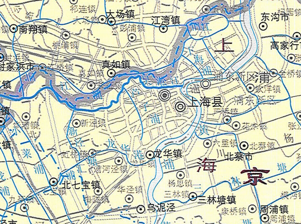 芦子浦,亦名西芦浦,其“南起肇嘉浜,北迄吴淞江”,时为上海县西部南北交通大动线,是北宋以来吴淞江南北向的十八条支流之一,后者称“十八浦”,包括“上海浦”“下海浦”“烂泥浦”等。芦子浦南起今肇嘉浜路、高安路口,北流穿过淮海中路、武康路、华山路、延安中路、南京西路、愚园路、万航渡路、康定路、余姚路、长寿路、沙洪浜,再过沪杭铁路,北入吴淞旧江(即虬江)。今上海卢湾区(旧区划)、卢浦大桥之名皆与此有关。芦子浦是陆深此行由吴淞江南下的必经水路。(图二)