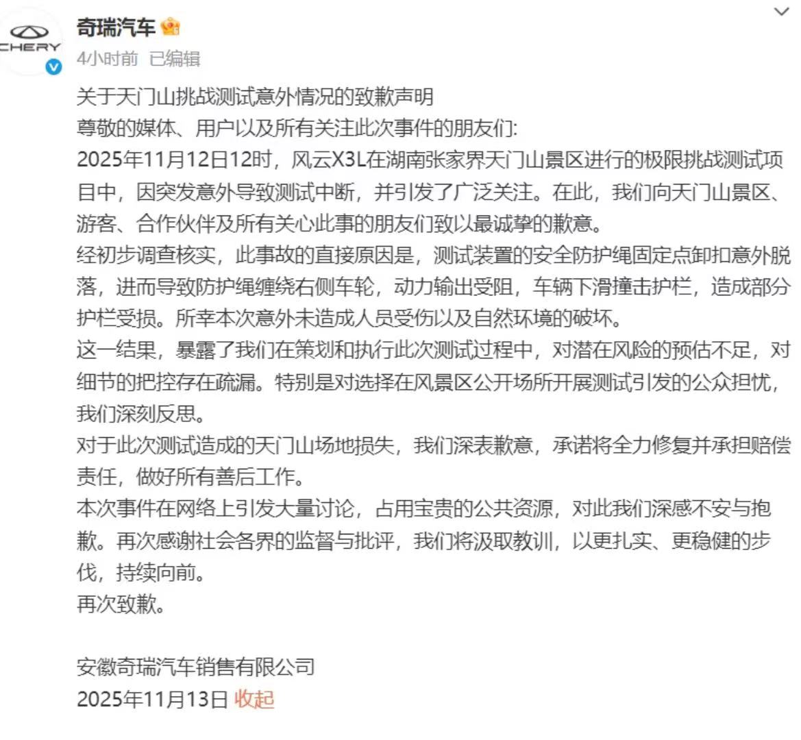 11月</span>13日凌晨,安徽奇瑞汽车销售有限公司就湖南张家界天门山挑战测试意外情况发布致歉声明。