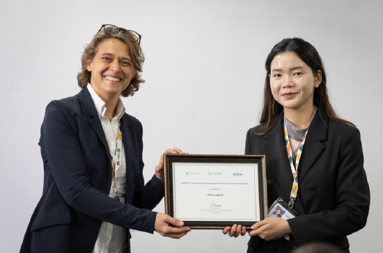 (图:COP30会议期间,联合国气候变化框架公约(UNFCCC)执行机制司司长 Sophie De Coninck向来自老挝的Alisa Luangrath团队颁发气候行动人工智能奖奖状)