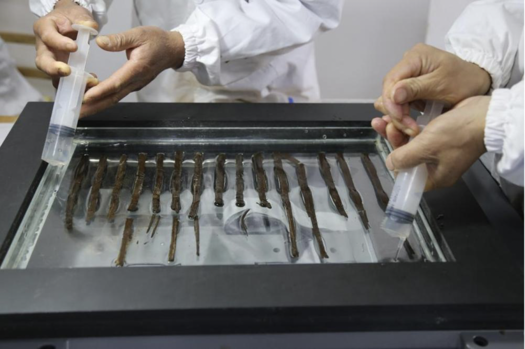 “竹简出土时大部份是饱水状态的,但有些竹简出土后却干缩得像卷曲的头发丝一样,加固过程中我们需要用化学药剂对竹简进行润胀复形,基本恢复到同批饱水竹简的状态,竹简像伸一个懒腰,就变直了。”