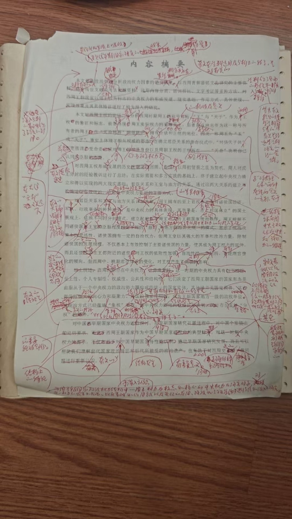 爱梅师姐和我,是老师的第一届博士生。有时回忆老师带我们读金文的场景,我不禁猜想,如果老师晚年身体一直健康,他的下一本专著是什么?按照老师在文献深耕的基础上,关注理论和思想,重视历史的解释性探讨的学术风格,他可能对于西周国家的政治形态作出进一步深入的研究,也许是一部新的《西周史》,与杨宽、许倬云两位先生的著作不同。爱梅师姐的博士论文《王权:西周中央权力研究》(1999),她花了很大力气写作,老师也花了很大的力气修改。一个月以前,爱梅师姐展示了老师当年批改的博士论文,我们羡慕的同时,也惊讶不已: