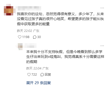 12日也是广东佛山首个中小学秋假的第一天,家长们放假的欢乐气氛瞬间刷屏。“秋假的意义真的具象化了!”“希望孩子们都能找到自己想要的秋天!”不少家长纷纷在社交媒体写下自己的心情。