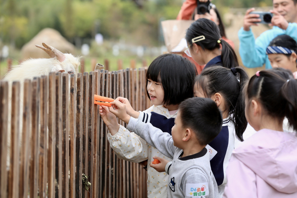 11月12日,浙江湖州市德清县,中小学生在象月湖度假谷喂羊。视觉中国 图