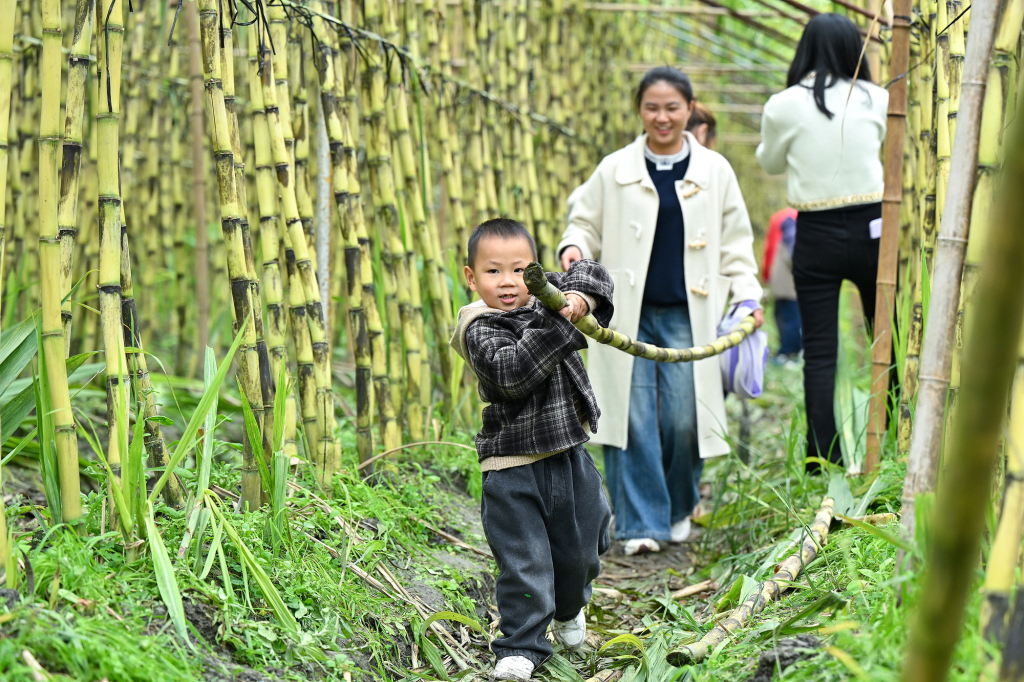 11月12日,四川成都,四川首个秋假正式开启,家长带孩子砍甘蔗。视觉中国 图