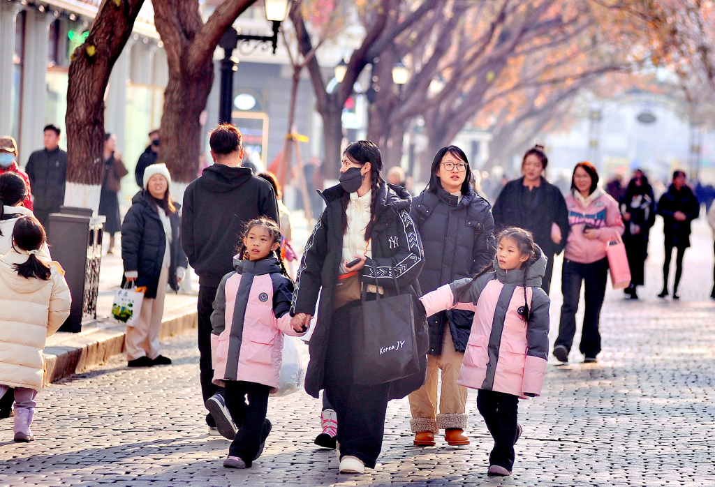 11月12日,黑龙江哈尔滨,来自南方游客在中央大街游玩。