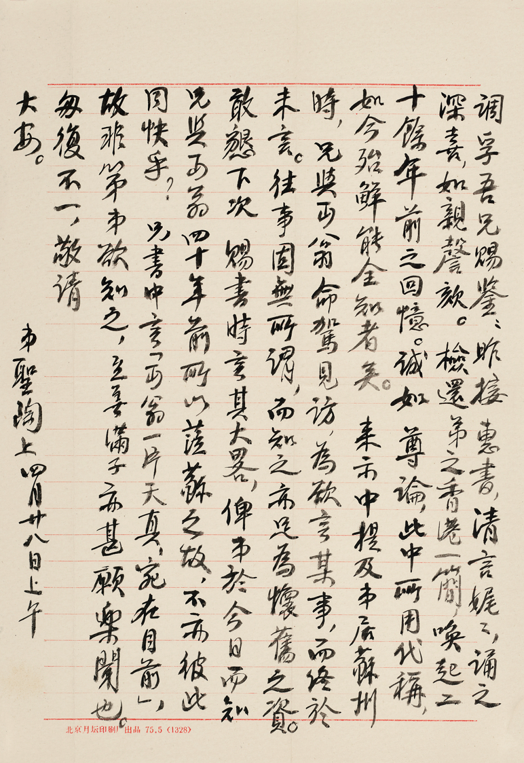 (二)调孚吾兄赐鉴:昨接惠书,清言娓娓,诵之深喜,如亲謦欬。检还弟之香港一简,唤起二十余年前之回忆。诚如尊论,此中所用代称,如今殆鲜能全知者矣。来示中提及弟居苏州时,兄与丏翁命驾见访,为欲言某事,而终于未言。往事固无所谓,而知之亦足为怀旧之资。敢恳下次赐书时,言其大略,俾弟于今日而知兄与丏翁四十年前所以莅苏之故,不亦彼此同快乎?兄书中言丏翁一片天真,宛在目前,故非第弟欲知之,至善、满子亦甚愿乐闻也。匆复不一,敬请 大安。 弟圣陶上,四月廿八日上午。
