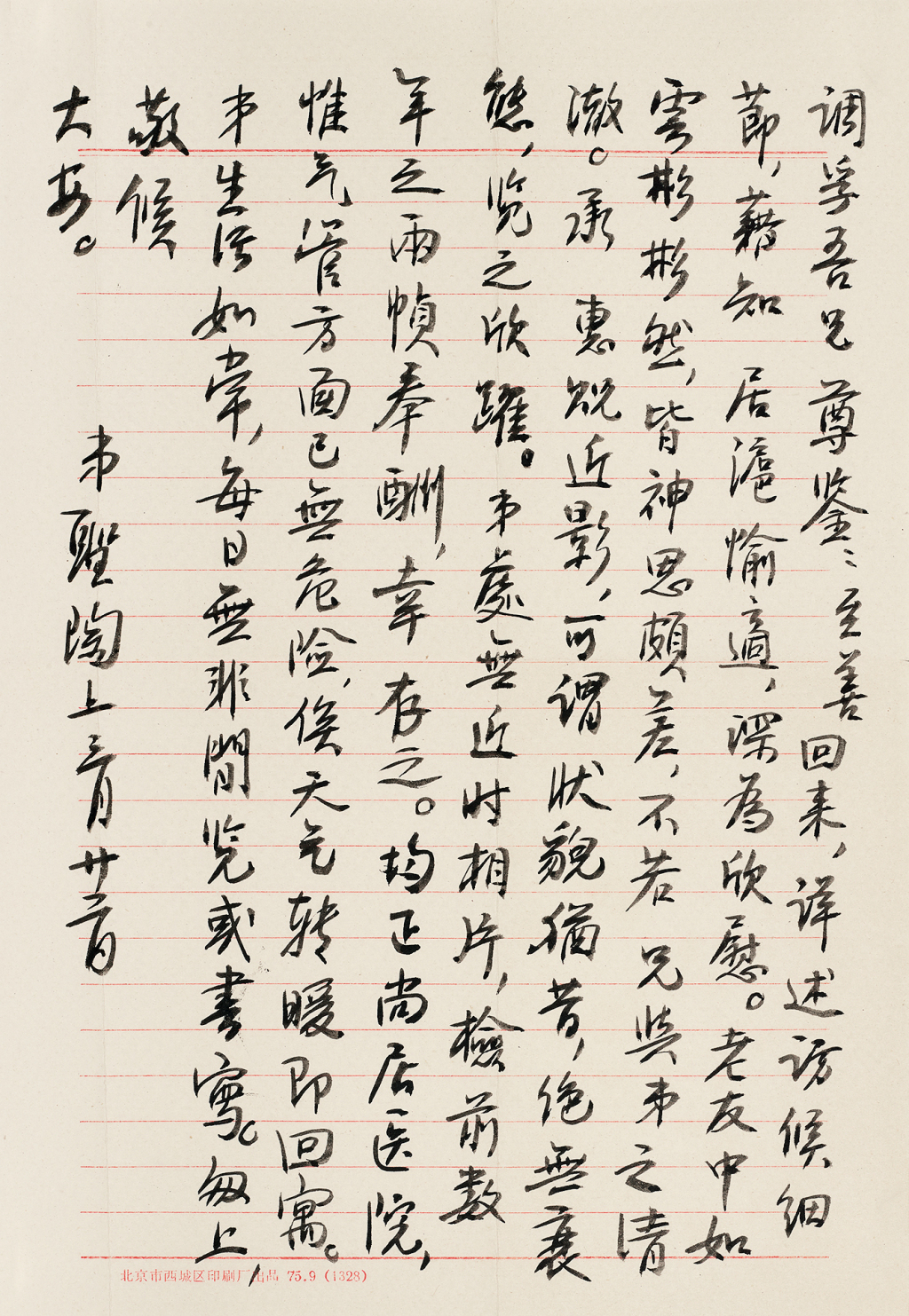 调孚吾兄赐鉴:上月廿六日手示及寄下弟之旧稿旧信与有关朱集之印刷件,皆已收到不误,展观之余,深感兄之厚意。兄必然关切此次地震。先可奉告者,北京城区受损较轻,诸友与弟家皆无恙。现皆夜宿露天。弟处于院中搭帐篷,上铺塑料布以御雨。胡同中,马路上,帐篷弥望,蔚为大观。《人民日报》与《参考消息》所记皆翔实,兄览之即可得其大概,故不多叙。五月之杪,弟与至善往清华访朱夫人。彼虽较衰弱,尚非甚老。多年未晤,晤谈一小时有余,深慰积想。因谈及佩弦之旧体诗稿,弟于六七月间设法搜集。弟之日记中有佩弦当时手写之十余首。朱孟实寄来彼所主编之《文学杂志》四八年十月号,此一期为纪念佩弦之特辑,其中有佩之《犹贤博弈斋诗钞选录》。而季镇淮则寄来编辑全集时流于彼处之《敝帚集》一册,为佩弦抗战以前之作。此数批合起来,虽未能称全豹,大约亦所缺不多矣。弟皆已抄出,编次先后,尚须徐徐研究。因兄关心,故书以奉告。即请大安,诸惟珍重。弟圣陶上,八月三日上午。