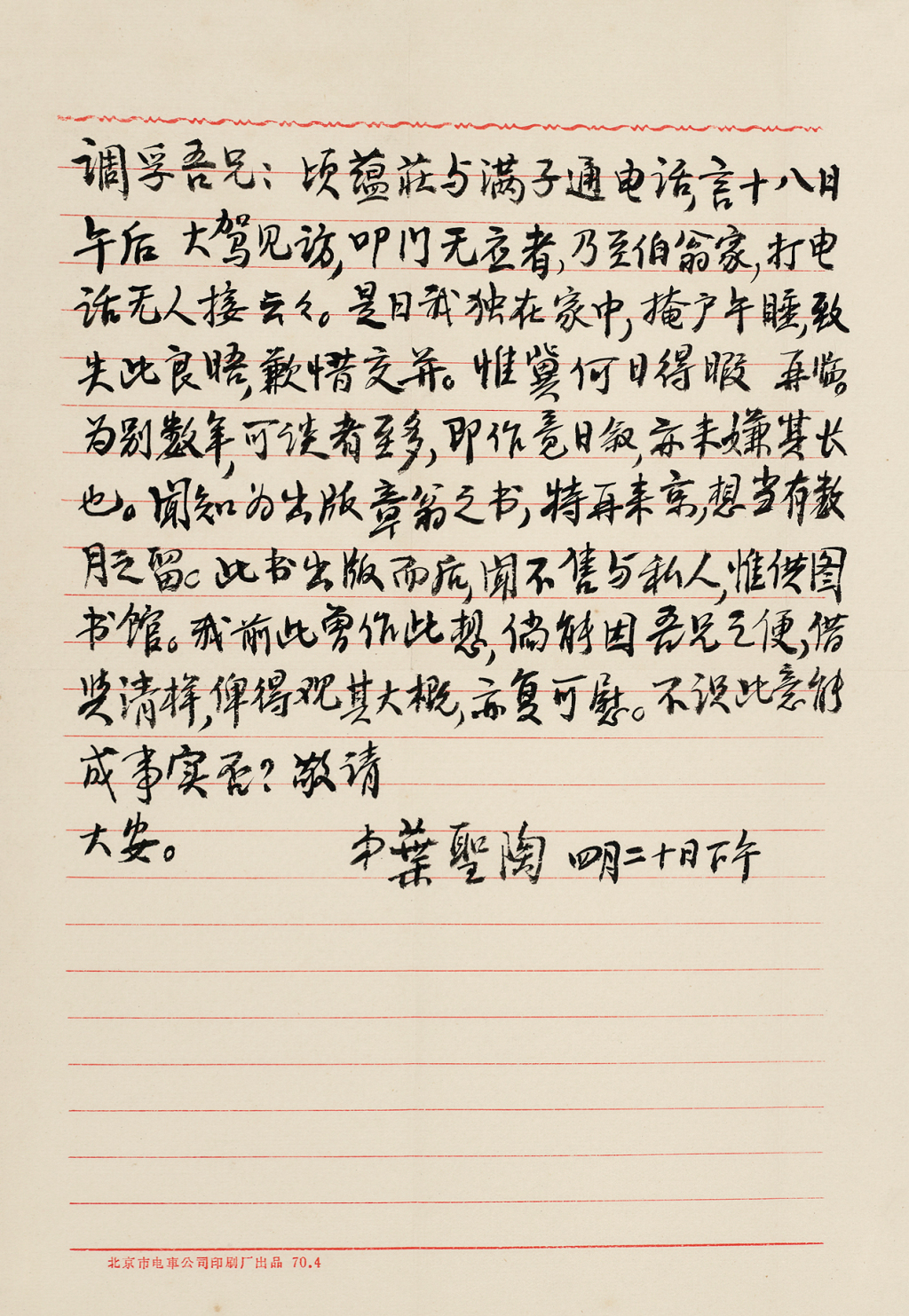 (三)调孚吾兄:顷蕴庄与满子通电话,言十八日午后大驾见访,叩门无应者,乃至伯翁家,打电话无人接云云。是日我独在家中,掩户午睡,致失此良晤,歉惜交并。惟冀何日得暇再临。为别数年,可谈者至多,即作竟日叙,亦未嫌其长也。闻知为出版章翁之书,特再来京,想当有数月之留。我前此曾作此想,倘能因吾兄之便,借与清样,俾得观其大概,亦复可慰。不识此意能成事实否?敬请大安。弟叶圣陶,四月二十日下午。