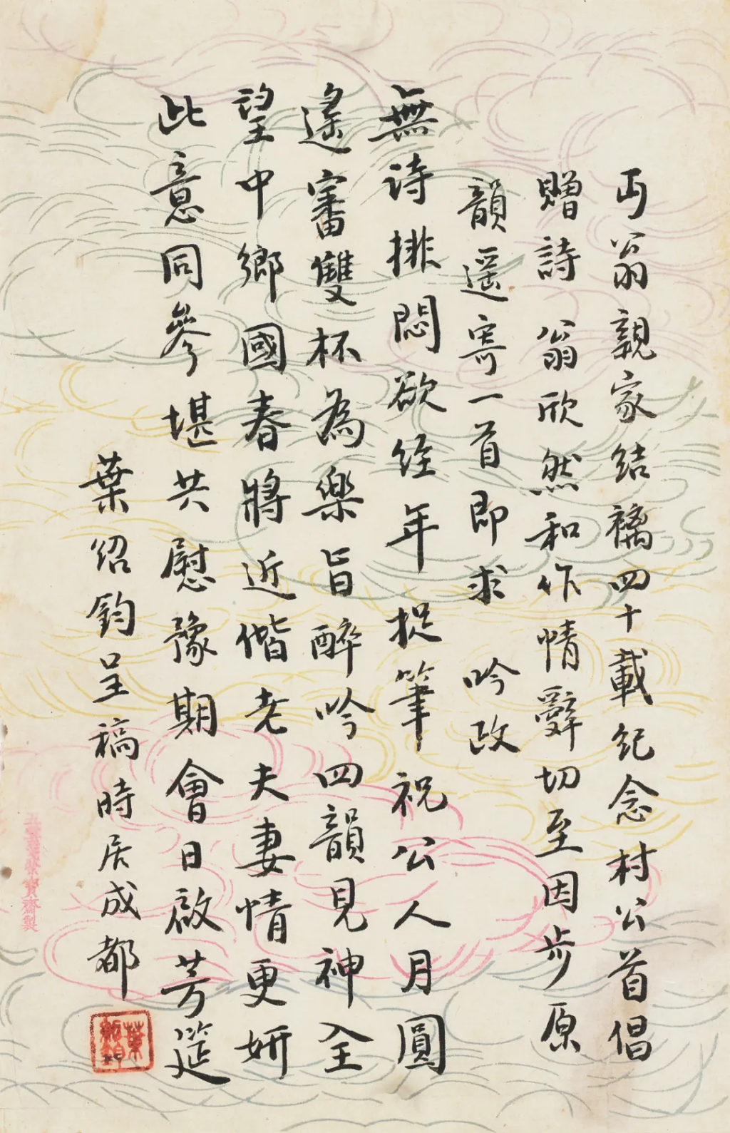 叶圣陶贺夏丏尊、金嘉伉俪结褵四十周年七律如此写道:“无诗排闷欲经年,捉笔祝公人月圆。遥审双杯为乐旨,醉吟四韵见神全。望中乡国春将近,偕老夫妻情更妍。此意同参堪共慰,豫期会日启芳筵。”落款写有“叶绍钧呈稿。时居成都。”