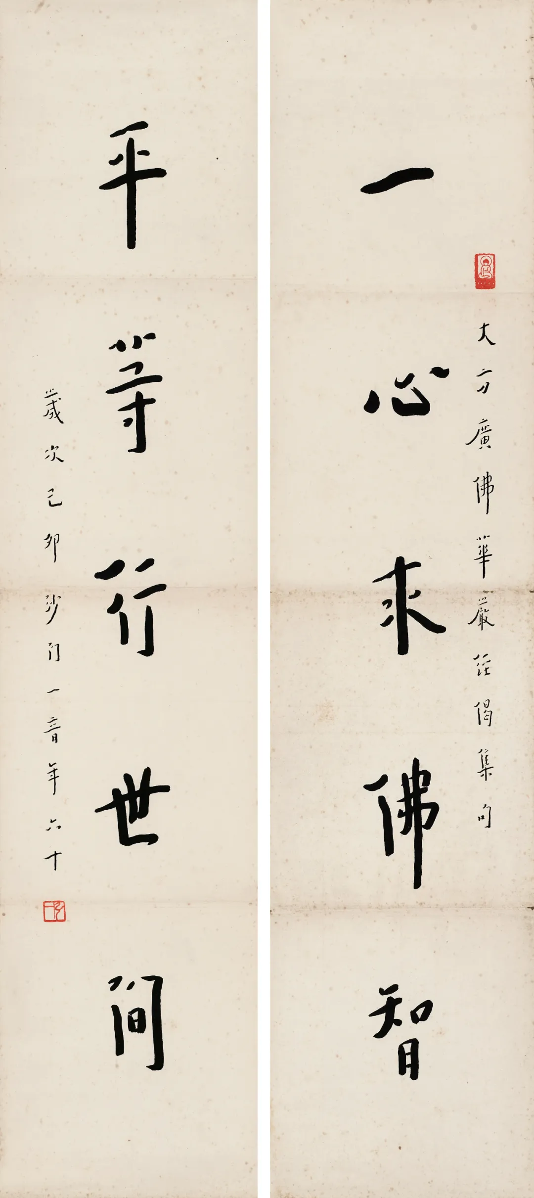 弘一(1880-1942) 行书五言联 镜心 水墨纸本 己卯(1939年)作 8017.5 cm(每幅) 一心求佛智,平等行世间。