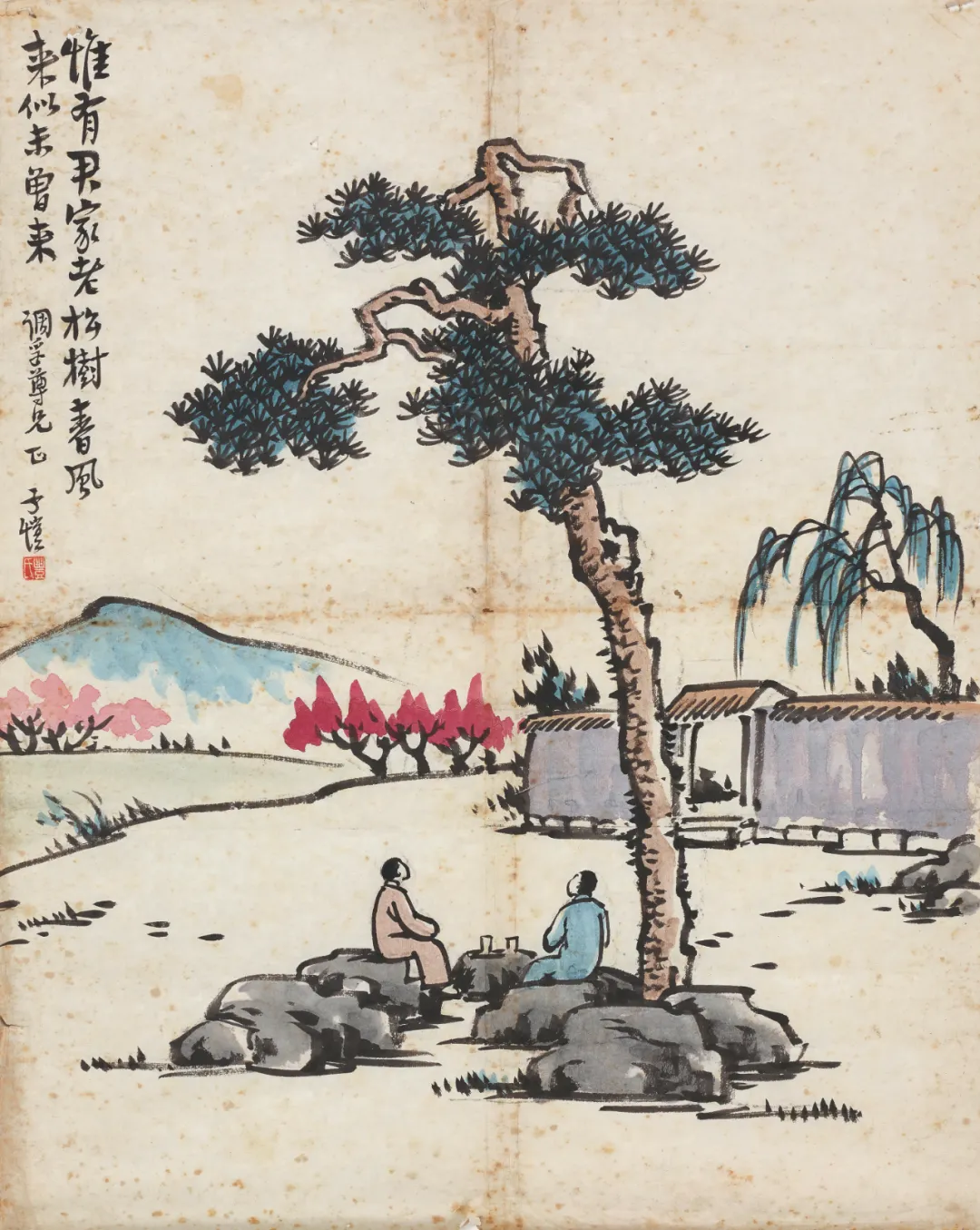 丰子恺(1898-1975) 春风来似未曾来 镜心 设色纸本 4334.5 cm 镜心 设色纸本 题识 惟有君家老松树,春风来似未曾来。调孚尊兄正。子恺。