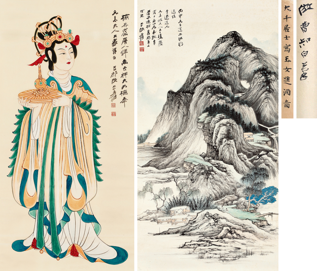张大千《玉女进酒图》(左)、《仿曹知白山水》