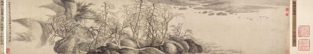 此卷作于康熙十四年乙卯,吴历四十四岁时,正中年力学,画艺大成之时。画中秋风茅亭,木叶尽脱,霜林飘摇,修竹萧萧。江边芦草渐稀,水落石出,大江空阔,群鹜南飞。境界幽冷岑寂,悠远清旷而生意无尽。画风与上博所藏之《白傅湓江图卷》、故宫博物院之《兴福庵感旧图》极为相似,皆四五十岁时极精之作。墨井造形能力极强,人物、界画俱善,画树尤佳绝,姿态生动,极尽变化,"四王"不能及也。此卷秋林萧索多姿,倍添诗意就是一证。其用墨在"清六家"中亦具特色,墨色青灰,既清润又浑厚,气息高雅而古朴。