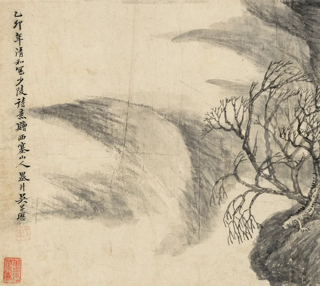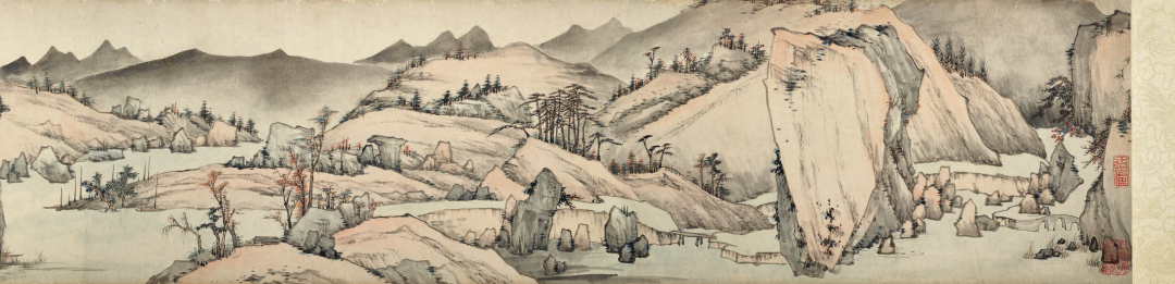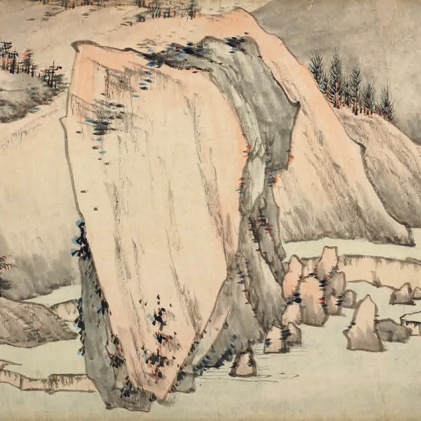 祝昌(明末清初)师承渐江,却兼取黄公望、程正揆之法,其《江山胜览图》作于1662年,以浅绛设色绘丘壑坡陀,溪山映带。