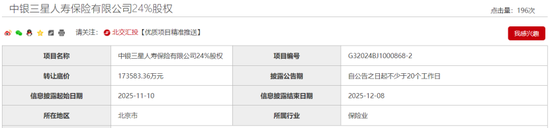 与此同时,中航集团在北京产权交易所重新上架中银三星人寿24%股权项目。此次转让底价17.35亿元,价格略有下滑,披露日期从2025年11月10日到2025年12月8日。