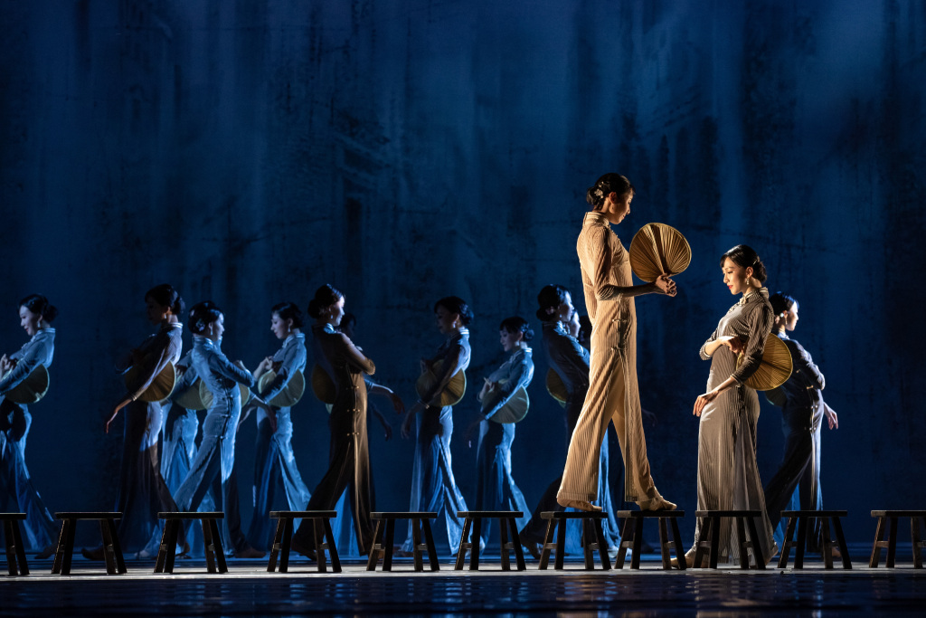 有一天,作曲杨帆接到陈飞华电话,要不试试《渔光曲》?一开始他并不想用,因为太经典,很多影视作品用过,担心观众听腻了。他试着结合舞蹈的节奏改编。演员排练时,舞蹈的速度很慢,慢到他怀疑人生。于是,他在旋律里加了很多细节,用弦乐铺垫情绪,用钢琴点缀节奏,才慢慢找到平衡。如今,每次看演员跳那段扇子舞,他都觉得《渔光曲》选对了。