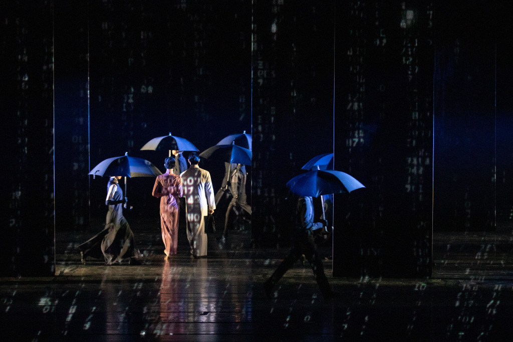 开场那段充满紧张气息的“雨伞舞”,已经成了舞剧标志。导演要求,雨的变化要配合音乐、表演,严丝合缝,不能多也不能少,“我准备了七八种素材,有密码雨,小雨和大雨,慢放雨和零星雨,本想挑几个,没想到导演全要。”“电波”首演后两三年,张松接到很多创作邀约,全是舞剧,有剧组甚至说就要“电波”那种雨。