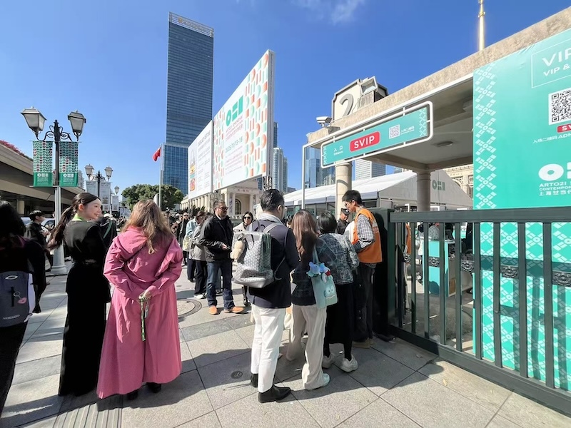 11月13日上午,上海展览中心门口的SVIP区域已排起长队,藏家们正等待第一时间进入场馆观看艺博会。排队的队伍里,有与好友组队前来的藏家,也有拖着拉杆箱独自前来的参观者。