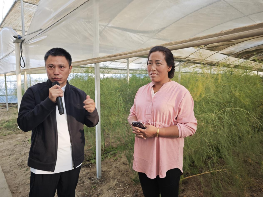 在扎囊县绿之源种植基地,李东平向采访团记者介绍卓玛通过自身努力熟练掌握现代农业种植技术。