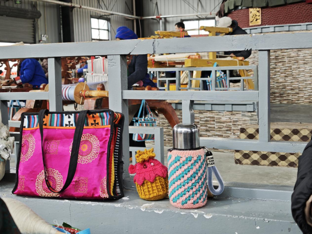达娃央金给自己织的保温杯套和酥油茶瓶套。粉红色的小包是合作社给每位员工发的藏族女士手提包,也是公司曾售卖的一款产品。
