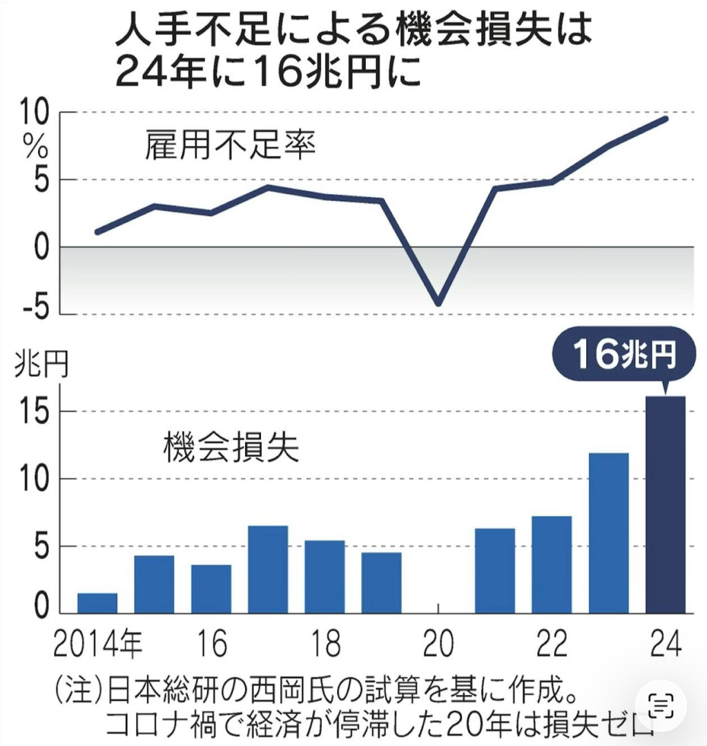 因劳动力严重不足所产生的“机会损失”规模高达年约 16 万亿日元。数据来源:日经新闻