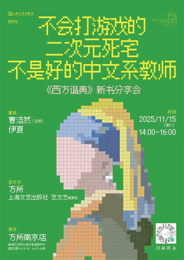 当《堂吉诃德》的冒险遇上《海贼王》的热血,当《源氏物语》的爱恨情仇在乙女游戏中重生,当尼采与本雅明的思想照进虚拟世界……我们是否找到了理解当下自我处境的新坐标?在这个被游戏、动漫等新媒介深刻塑造的时代,我们与经典文学之间,似乎隔着一层名为“时代”的厚壁。经典被悬置神坛,其原有的鲜活与“好看”却被遗忘。华东师范大学中文系青年教师曹洁然,一位游走在文学经典与游戏媒介之间的学者与玩家,发起了一场对经典的“二次元重制”。她以游戏研究者的“鬼扯”精神,拆解了横亘在经典与大众之间的高墙。11月15日,曹洁然将携新书《西方谐典:二次元时代的文学阅读指南》做客方所南京店,与“西夏酒馆”播客主播、读书博主伊夏一起分享她们在二次元和经典之间穿梭收获的经验。