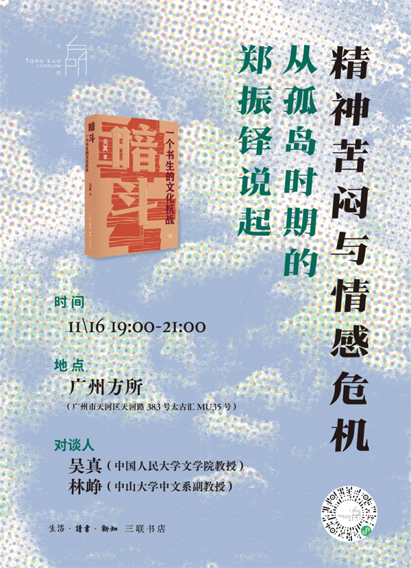历史中的“孤岛”,不仅是地理的隔绝,更是心灵的囚牢。当我们回望郑振铎在沦陷区的岁月,目光往往聚焦于他抢救国宝的壮举与文化抗战的功业。然而,在公共身份的背后,那个被危机、恐惧、孤独与责任重重包裹的个体,其内心正经历着怎样的风暴?吴真在《暗斗》第七章中,以细腻的史笔探入了一个更为幽微的领域——郑振铎与一位女士之间复杂而深刻的情感羁绊。这不仅是一段私人的情感记录,更是一扇通往历史人物精神世界的密钥。本次对谈,我们特邀作者吴真与学者林峥,从这段情感故事说起,从一封封信件、一处处细节入手,共同解开孤岛时期知识分子的精神图景,去感受一个在时代洪流中饱受精神苦闷与情感危机煎熬的灵魂。看他如何在公与私、理与情、绝望与希望的巨大张力中,走过那一段黑暗,并最终完成了自我与时代的双重见证。