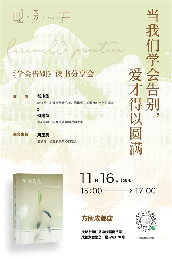 《学会告别》不是一本关于死亡的书,而是一部关于如何深情地活的书。当父母渐渐老去、孩子逐渐长大,我们如何在相伴与离别之间,学会不逃避,学会以理解与爱去面对终有一别的人生?“学会告别”其实是“向死而生”的过程——当我们直面死亡,才更能体悟生命的重量与爱的圆满。11月16日,我们邀请《学会告别》作者彭小华、肿瘤内科专家兼生死学者何建萍,共同展开一场关于爱、失去与向死而生的对谈——当我们学会告别,爱才得以圆满。