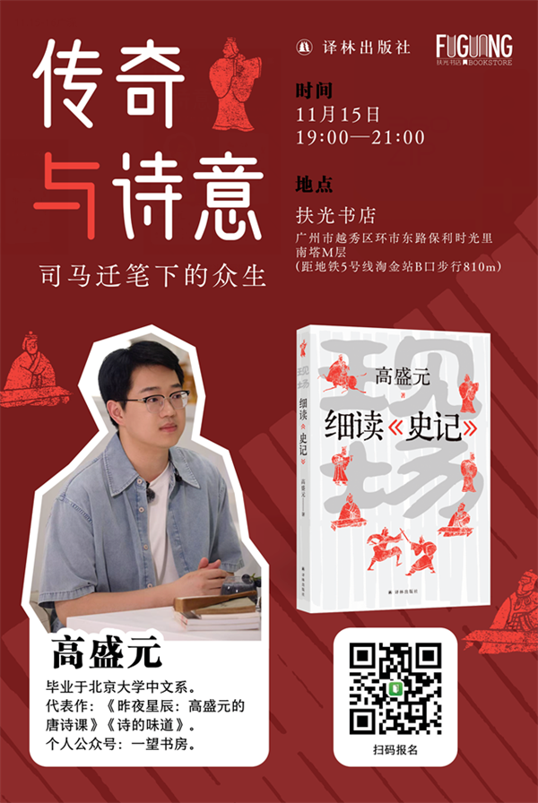 《史记》陪伴了我们整个学生时代——从小学课本里的《将相和》到初中的《陈涉世家》,再到高中的《鸿门宴》,就连高考文言文阅读,也常有它的身影!11月15日,深受年轻人喜爱的古典文学解读人高盛元老师,将带着他的新书《现场:细读<史记>》来到广州,带你在文字中重逢历史,于解读中读懂人生。