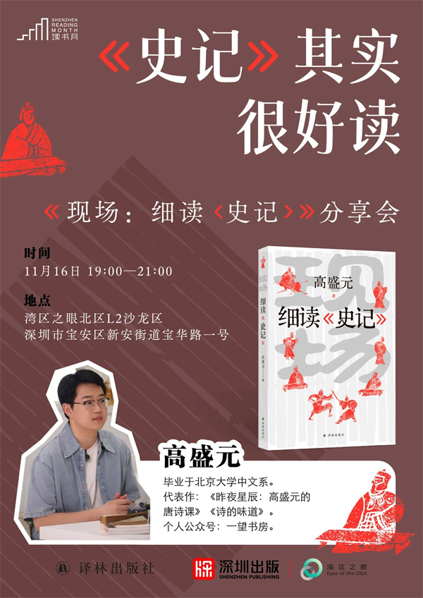 国学大师钱穆说:“读《史记》,可长一套聪明、一套见识。”但《史记》全书52万余字,还全是文言文,该怎么入门?从哪里开始?11月16日,深受年轻人喜爱的古典文学解读人高盛元老师,将带着他的新书《现场:细读<史记>》来到深圳,带你在文字中重逢历史,于解读中读懂人生。