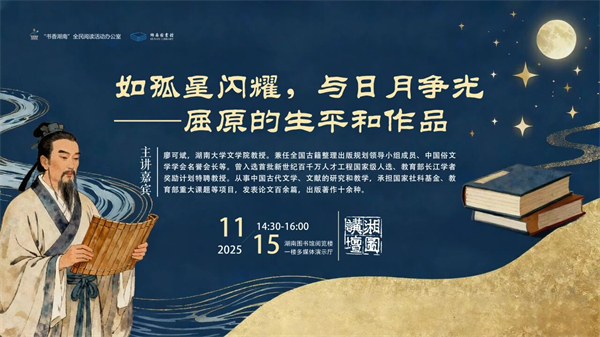 浩渺的历史长河中,伟大的诗人屈原以其卓越的才华和坚贞不渝的爱国情怀,谱写了一曲曲感人至深的诗篇。他的诗篇,情感深沉,意境深远,更体现了他对国家和人民的深深忧虑与关切。本期讲座,廖可斌教授将介绍屈原的生平经历,对日本学者提出的“屈原否定论”予以辨析;分析屈原的政治理想和人生理想,揭示屈原的精神和人格的伟大之处及其与湖湘文化传统的关系,对当代人的启示意义;并以《离骚》《山鬼》两篇作品为例,寻绎其中的情感逻辑和表现技巧,品味屈原诗歌的艺术魅力。