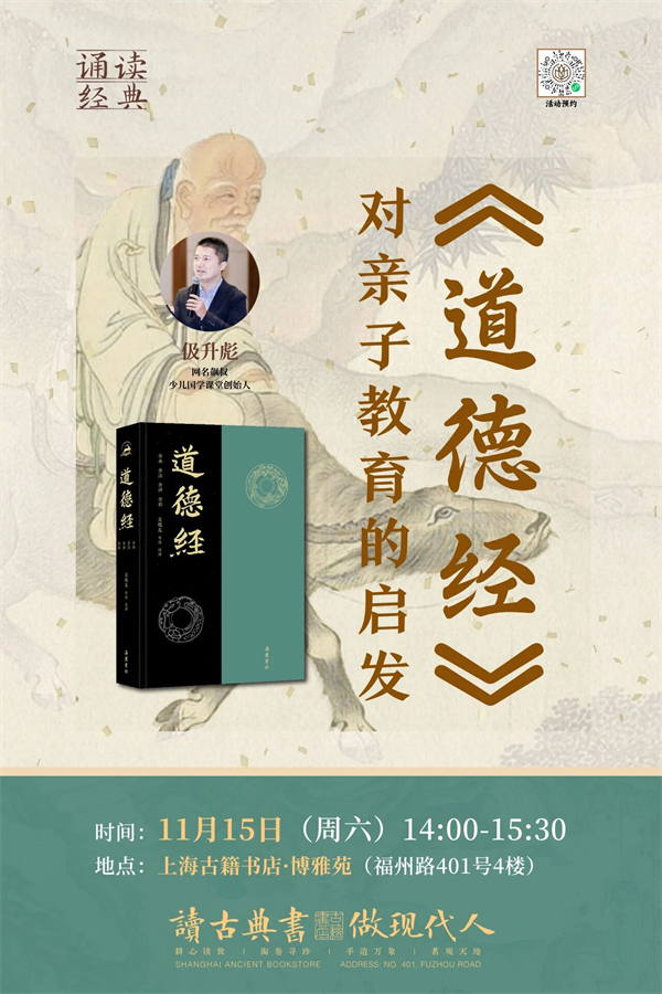 作为中国传统经典中最富智慧的书籍之一,《道德经》对于亲子教育也有极大的启迪和参考价值。11月15日,少儿国学课堂创始人伋升彪,将和读者一起聊聊《道德经》这部典籍究竟神奇在哪里,以及它对亲子教育有着怎样的启发。