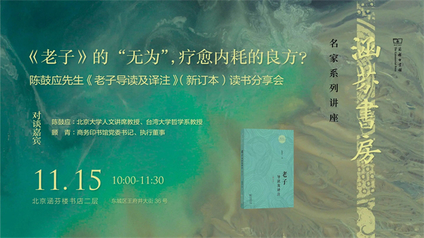 11月15日,九十岁高龄的北京大学人文讲席教授、台湾大学哲学系教授陈鼓应先生将与商务印书馆党委书记、执行董事顾青对谈,从《老子》的“无为”启程,探究如何疗愈盛行于当代社会的“内耗”。
