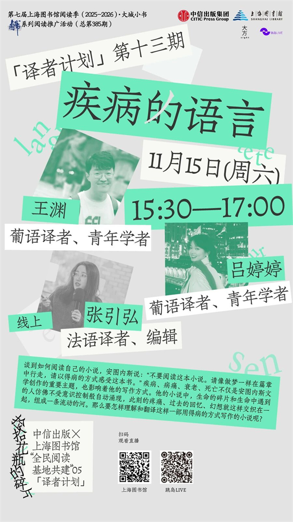 嘉宾:王渊(北京大学外国语学院欧语系助理教授)、吕婷婷(美国威斯康星大学麦迪逊分校葡语专业博士研究生)、张引弘(译者、图书编辑)